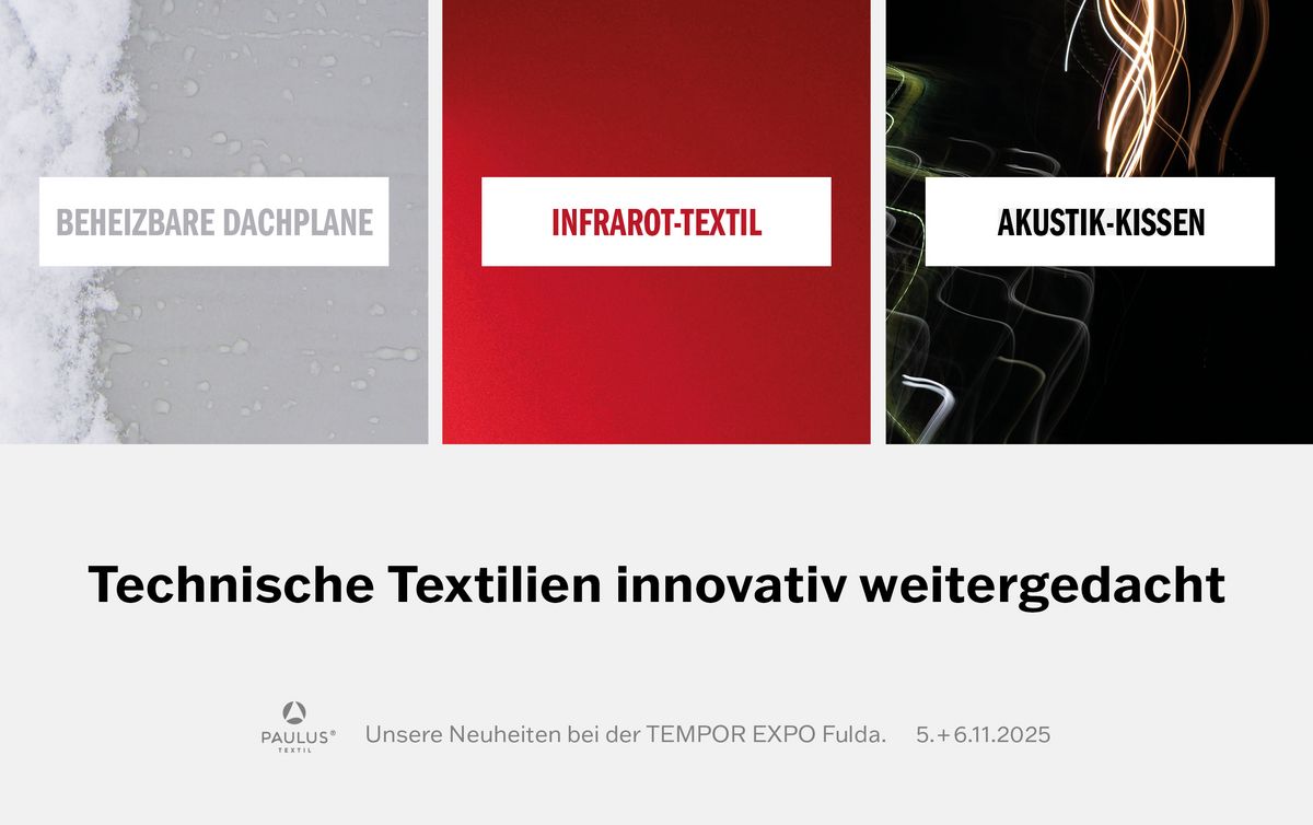 Gleich drei Neuentwicklungen stellt Paulus Textil auf der TEMPOR EXPO in Fulda vor. Unter dem Titel »Technische Textilien innovativ weitergedacht« möchten wir den Möglichkeitshorizont des Einsatzes technischer Textilien weiter aufspannen.