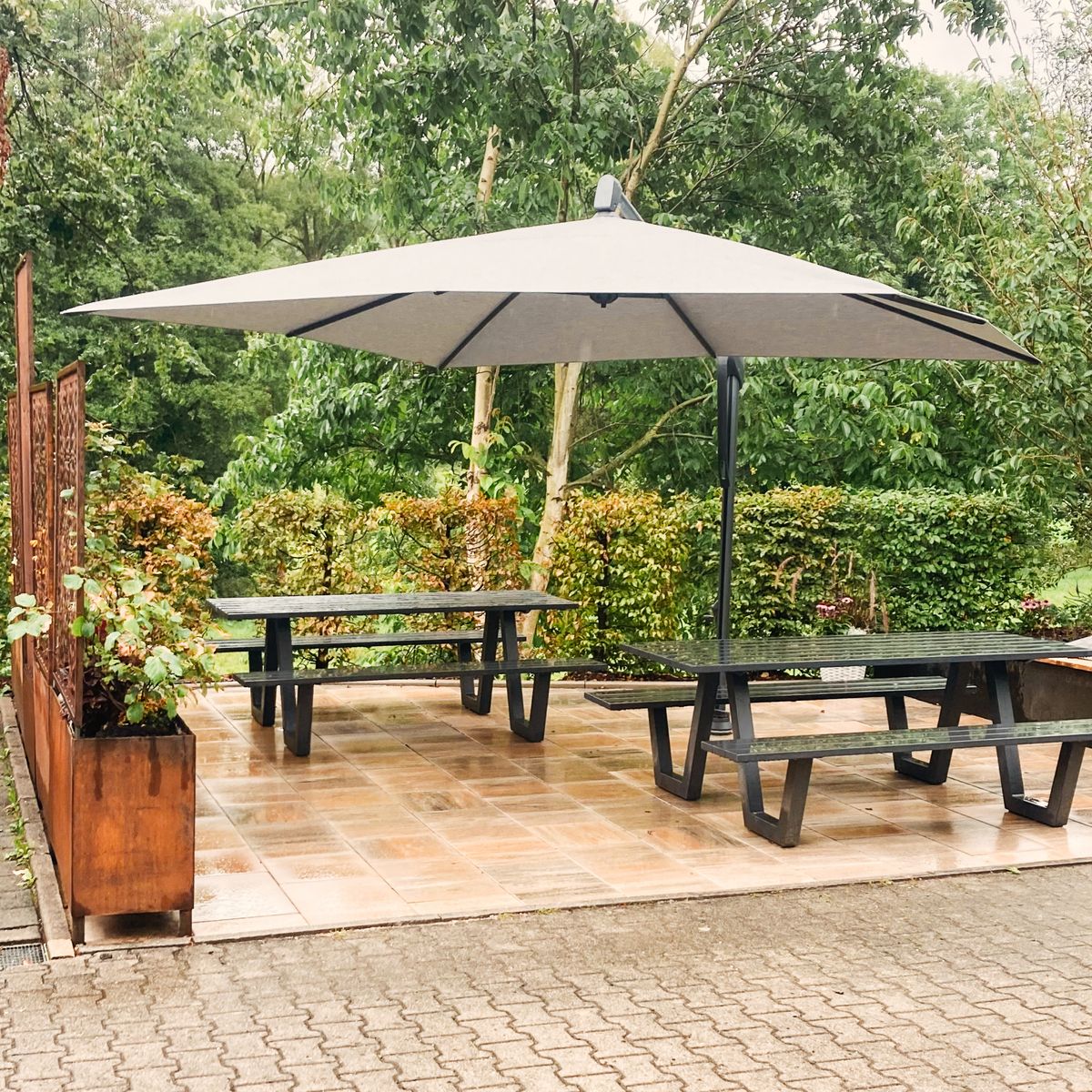 Für besonderen Komfort lassen sich die Großschirme zusätzlich mit einer Motorisierung, Infrarotheizung oder Beleuchtung ausstatten.