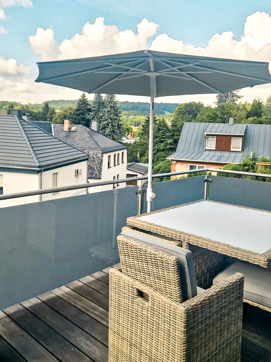 Glatz Mittelstockschirme, darunter die Modelle Alexo®, Piazzino®, Twist, Teakwood und Alu-Smart,sind ausgezeichnet auf Balkonen und Terrassen oder als Ergänzung zu Großschirmen – insbesondere, wenn es räumliche Einschränkungen gibt. Sie sind leicht zu händeln und harmonieren mit Neu- und Altbauten.